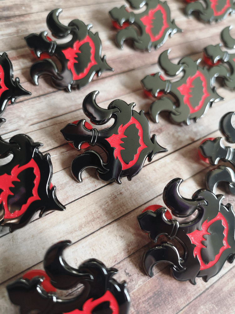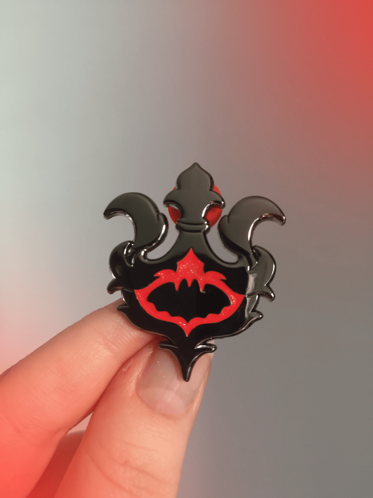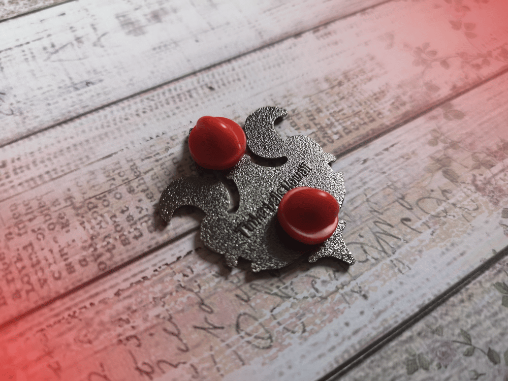 Hard enamel pin in Black/silver metal color. 2 clutch. back stamp name in the back.