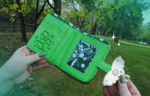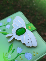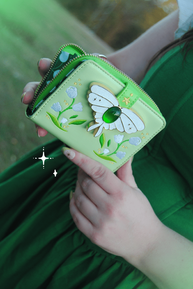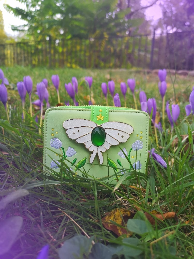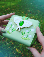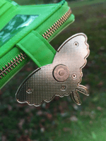 Has a leaf zipper and a lovely butterfly hardware closer with an acrylic 3D gem (not real) and smooth glitter in white.