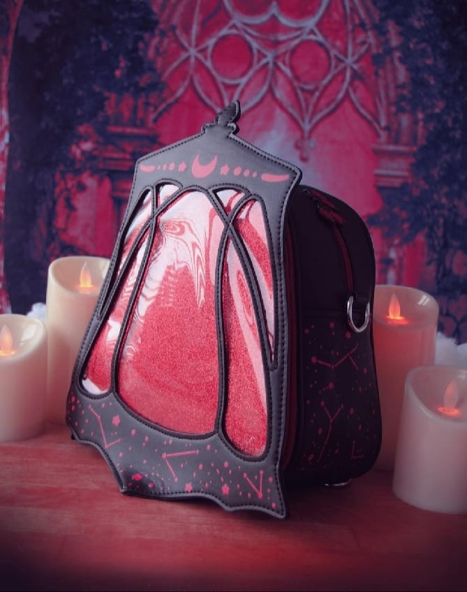 This Ita Bag is made with vegan leather with black and red bats custom fabric inside of the biggest compartment has an internal zipper plus 2 pockets and other zipper in the outside back. They have vampire design enamel zippers and full red printed design in the frontal and sides. Red glitter insert for pins included.